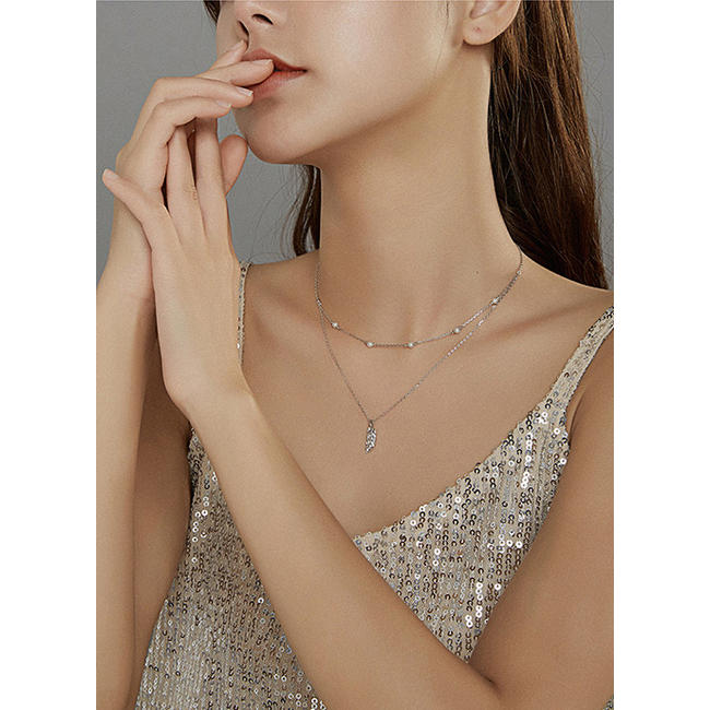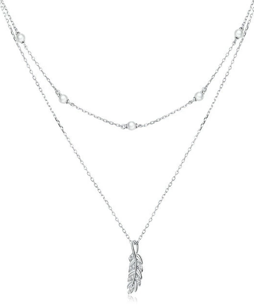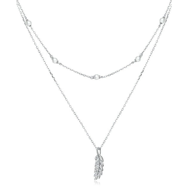 Εντυπωσιακό κολιέ, με ιδιαίτερο και μοναδικό design. Διαθέτει δυο αλυσίδες, η μία διακοσμημένη με πέρλες και η άλλη με μενταγιόν σε σχήμα φτερού, διακοσμημένο με κυβική ζιρκόνια που αντανακλά μοναδικά το φως και προσφέρει λάμψη στο κόσμημα.