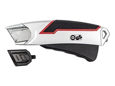 Featuring a zinc alloy housing combined with a rubberized grip zone, it offers strength, durability, and comfortable handling. Notably, the cutter employs a spring-loaded trapezoidal blade made of SK5 carbon steel that is 19 mm wide and provides automatic retraction after cutting for enhanced safety.
