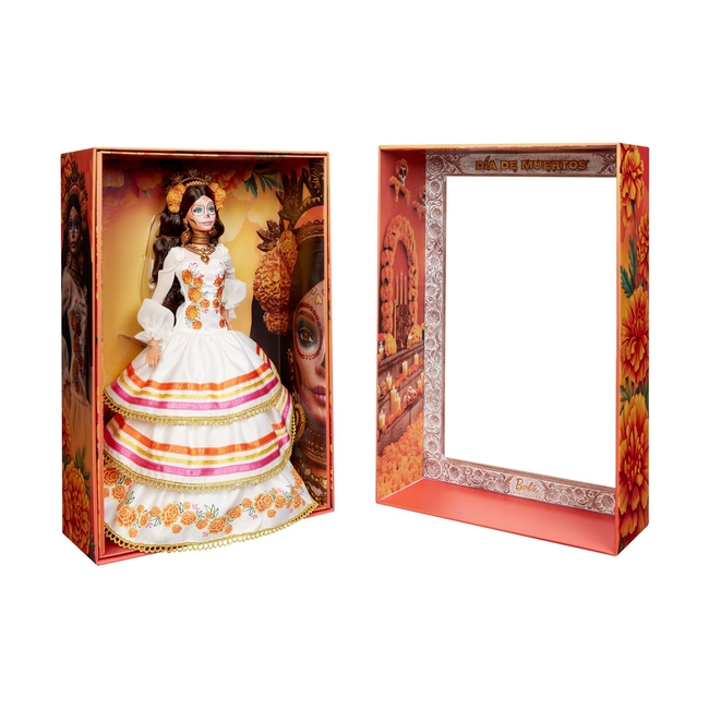 Alongside its remarkable attire, the doll features a coordinating headpiece, dramatic jewelry, and intricate sugar-skull-style makeup. Designed by the talented Ari Sarinana, with packaging design by Charis Ceniseroz, this piece truly embodies the spirit of a cherished cultural celebration.