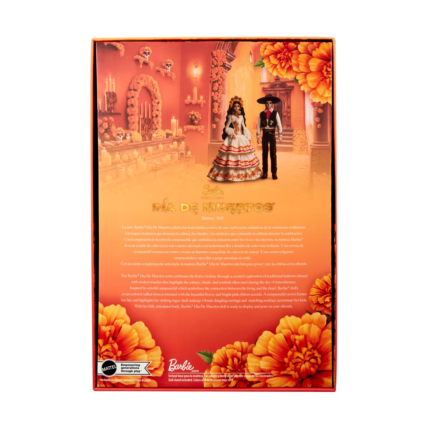 The 2025 Mattel Barbie Dia De Los Muertos Doll (JBJ05) is a stunning collectible that pays homage to the vibrant traditions of the Day of the Dead holiday. This doll showcases a unique design with a multi-tiered gown adorned with a cempasúchil flower motif that captures the essence of this festive occasion.