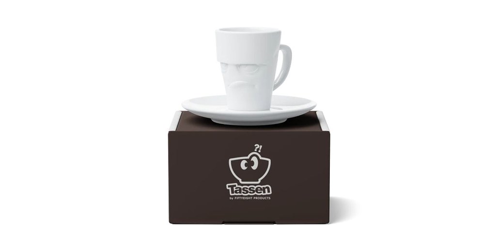 The FIFTYEIGHT Espresso Mug mit Henkel 80ml - Grummelig weiß is an exquisitely crafted mug designed to enhance your espresso experience. With its unique grumpy facial expression, this mug adds a touch of personality to your coffee routine. Made from genuine hard porcelain, it guarantees durability and elegance.