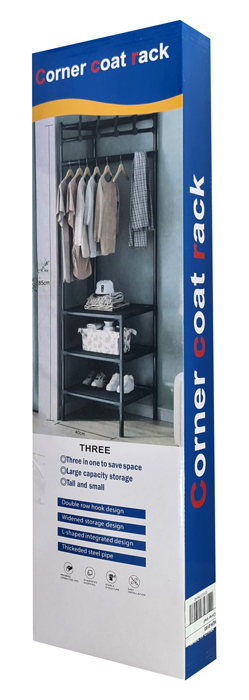 Γωνιακή κρεμάστρα δαπέδου για την αποθήκευση και οργάνωση ρούχων και άλλων προσωπικών αντικειμένων. Διαθέτει μεταλλικό συναρμολογούμενο σκελετό και στο κάτω μέρος της προσφέρει χώρο για την αποθήκευση παπουτσιών και άλλων αντικειμένων.