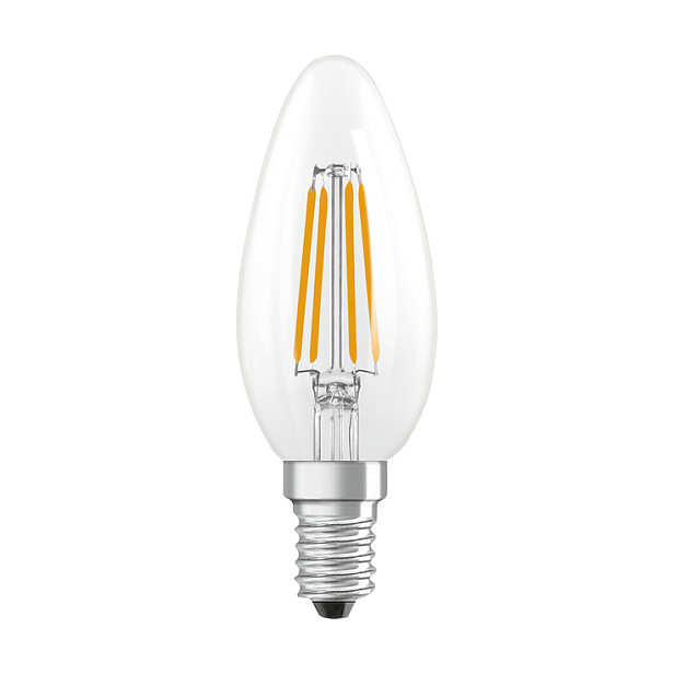 The Osram LED Classic B 40 Filament DIM P 3.4W 827 Clear E14 is a dimmable, filament-style LED candle lamp, perfect for both decorative and general lighting applications. This lamp is designed to directly replace a 40W incandescent bulb, providing an energy-efficient solution.