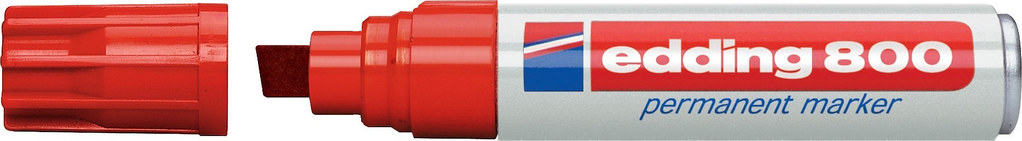 The Edding 800 Perm Marker Red (4-800002) is a high-quality permanent marker designed for bold, clear, and durable markings. It features a broad chisel-shaped nib that produces lines ranging from 4 to 12 mm in width, making it incredibly versatile for various uses.