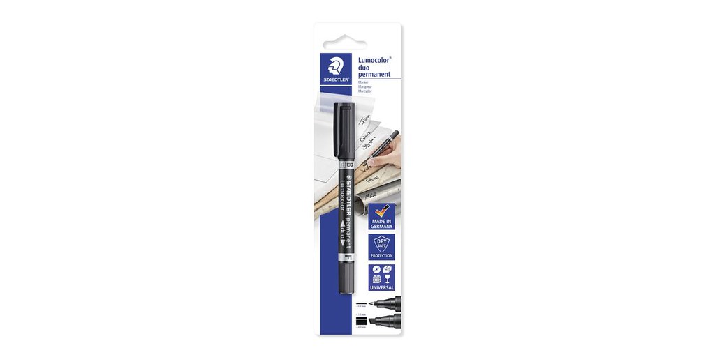 The STAEDTLER Lumocolor permanent duo 348 B-9 BK is a versatile and reliable tool for your marking needs. This refillable dual-tip permanent marker features black ink and is designed to write and mark on almost any surface.
