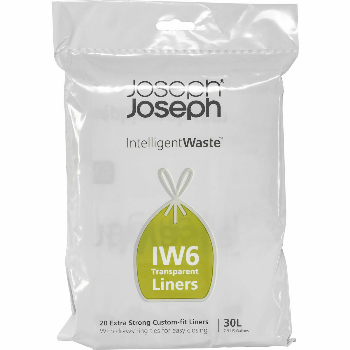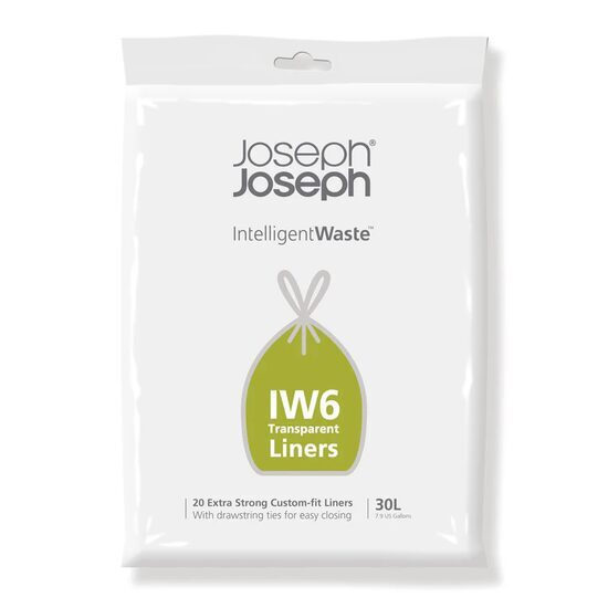 Joseph Joseph Bin Liners are custom-fit 30L trash bags designed for Joseph Joseph bins, offering a snug fit and extra strength. The pack contains 20 transparent liners with drawstring ties for easy closing and carrying. Made from durable plastic, these liners are extra-strong and intended to securely hold household waste. The perforated peel packaging makes dispensing convenient. This product is identified by SKU 726168, MPN 30118, and EAN 5028420003833, and corresponds to the IW6 Clear variant. Pack dimensions are approximately 31.5 x 20.5 x 4 cm. Suitable for compatible Joseph Joseph 30L bins, these liners are a practical replacement accessory for regular household waste disposal.