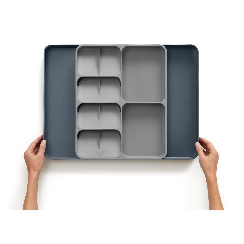 FeaturesExpandable design; stacked/tiered cutlery compartments; large utensil compartment; twin gadget compartments; deep-sided storage; movable dish for small items; non-slip feet; space-saving layout