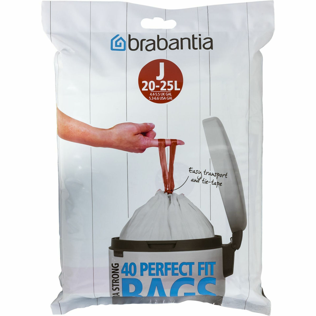 Brabantia PerfectFit Bin Liner Type J 20-25 L is a pack of heavy-duty, tear-resistant trash bags designed for Brabantia bins with a capacity of 20–25 liters. The pack contains 40 bags and uses Brabantia size code J for easy identification and perfect fit. The liners are made for a clean, neat fit with no visible overhang when the lid is closed. They feature a drawstring or tie-tape closure for easy sealing, removal, and transport. Compatible with selected Brabantia 20–25 L bins, these bags are made for convenience, durability, and a tailored fit.