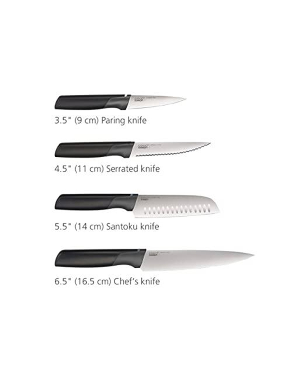 Knife Types3.5" paring knife; 4.5" serrated knife; 5.5" santoku knife; 6.5" chef's knife