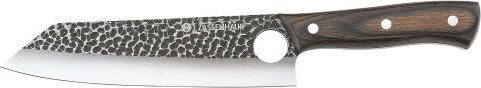 FeaturesHandcrafted design; balanced and robust; suitable for kitchen and outdoor use; secure grip hole in blade; sharp edge; practical carrying sheath