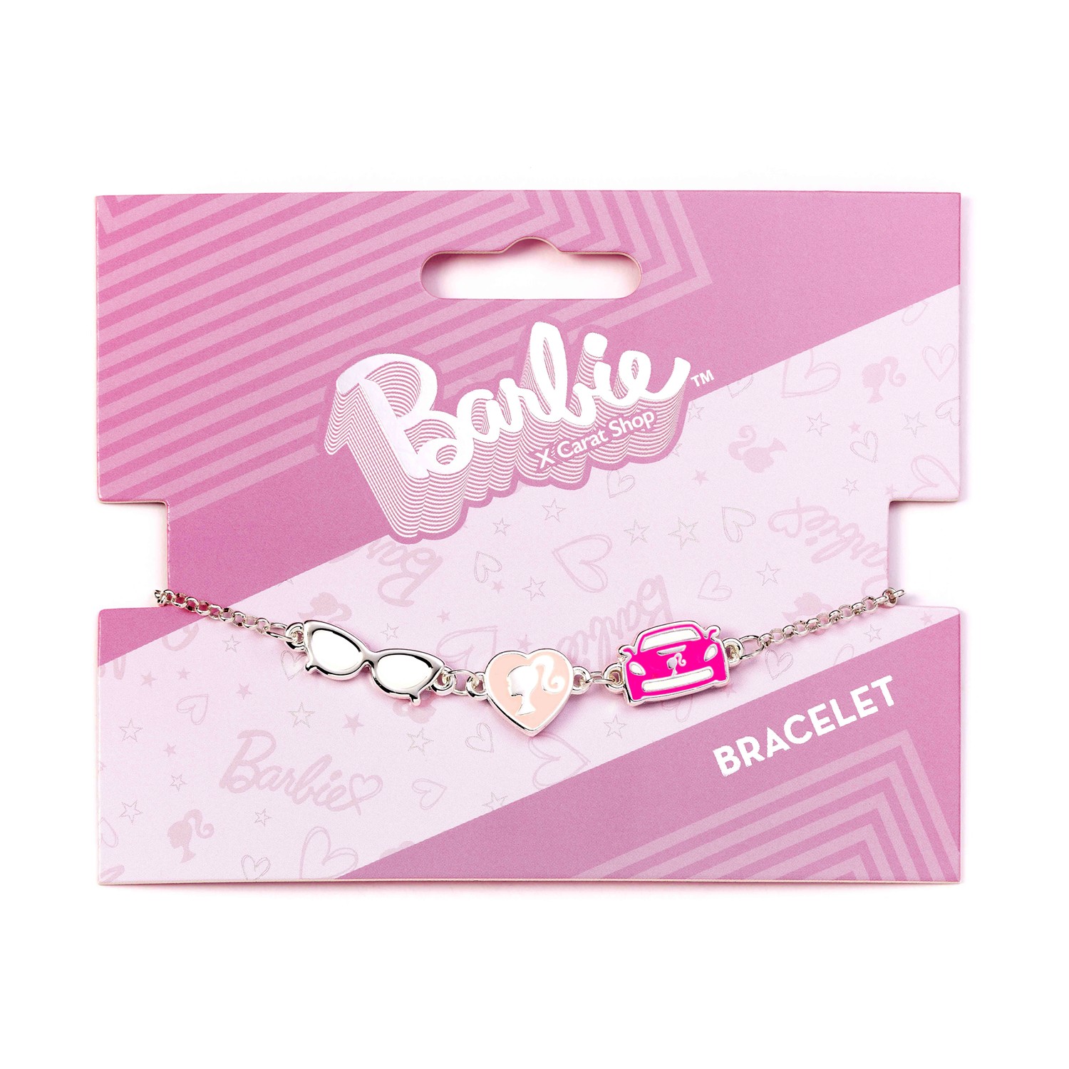 Βραχιόλι της The Carat Shop Ltd από την επίσημη συλλογή Barbie, με λεπτή αλυσίδα και τρία αποσπώμενα εμαγιέ charms εμπνευσμένα από τα κλασικά στοιχεία της Barbie. Περιλαμβάνει charm με τη σιλουέτα της Barbie, charm με γυαλιά και charm με Corvette. Πρόκειται για fashion accessory με κομψό σχέδιο που φοριέται μόνο του ή συνδυάζεται με άλλα βραχιόλια της συλλογής. Το προϊόν είναι κατάλληλο για ηλικίες 14 ετών και άνω. Διαστάσεις συσκευασίας 12 x 10 x 1 cm και βάρος περίπου 40 g.