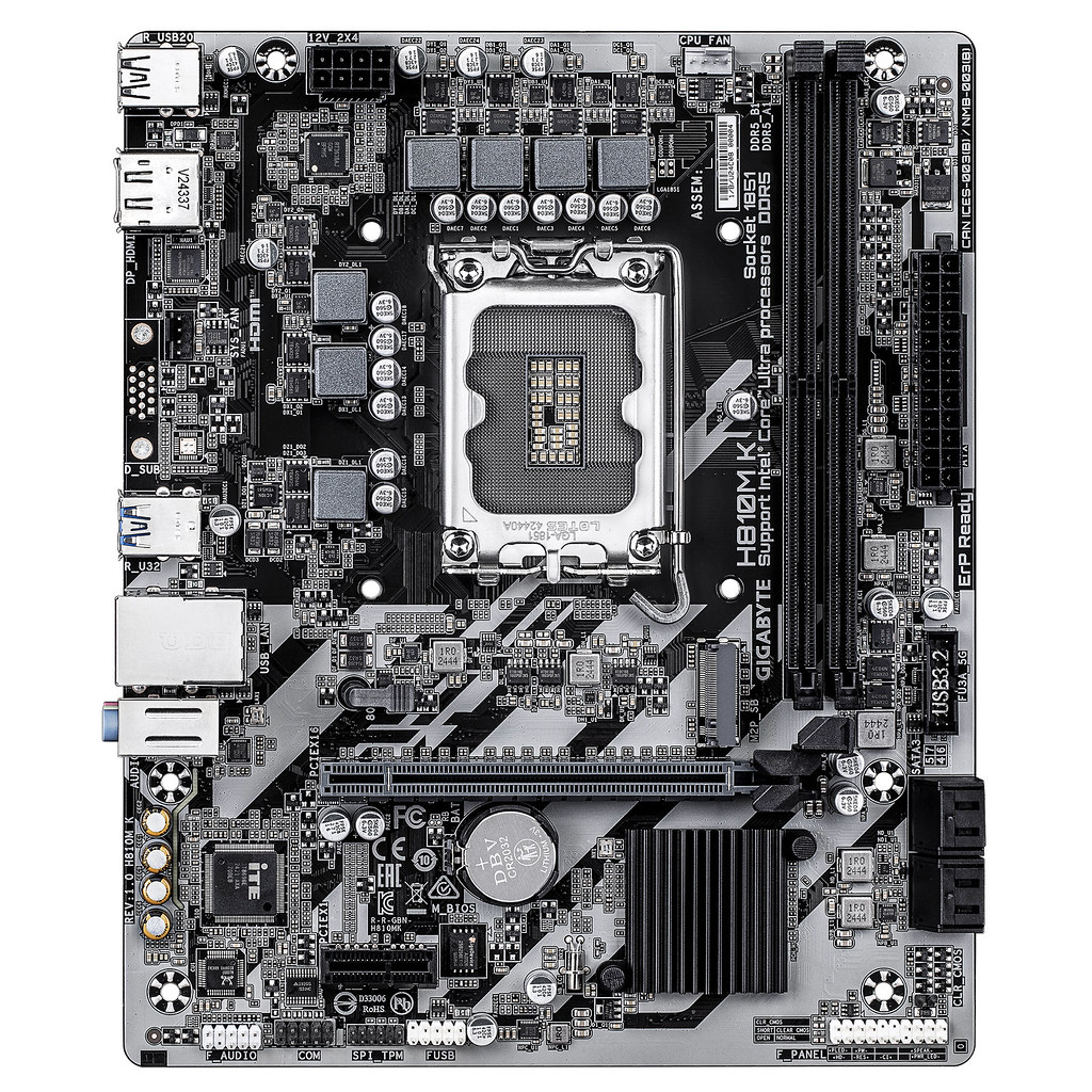The Gigabyte H810M K is a micro-ATX motherboard crafted for Intel's LGA 1851 socket, optimized for Core Ultra processors (Series 2). This motherboard features a hybrid 3+1+2 phase VRM power design, ensuring stable power delivery with a 24-pin ATX power connector and an 8-pin CPU UD solid pin connector.