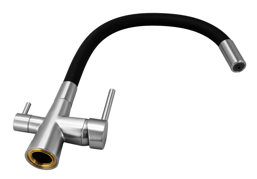 Αυτή η μπαταρία πάγκου κουζίνας διαθέτει τρίοδο σχεδιασμό για τη σύνδεση με φίλτρο νερού και το δίκτυο παροχής ζεστού και κρύου νερού. Έτσι, μπορείτε να απολαμβάνετε καθαρό, φιλτραρισμένο νερό και να επιλέξετε παράλληλα ανάμεσα σε ζεστό και κρύο νερό με τους διακόπτες.
