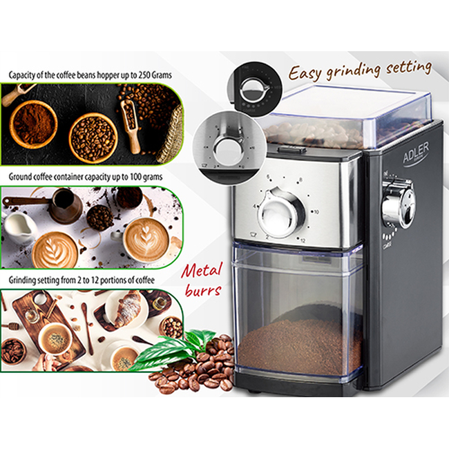 The Adler AD 4300 Burr Coffee Grinder is an exceptional choice for coffee aficionados who appreciate precision and quality in their coffee preparation. This grinder employs a high-quality conical burr mechanism that produces even grinding, which is vital for enhancing the rich flavors of your coffee.