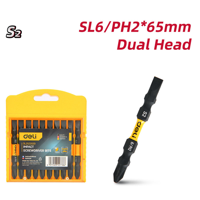 DELI σετ μύτες κατσαβιδιού DL252202D για δραπανοκατσάβιδο, διπλή κεφαλή, σταυρωτές/ίσιες, SL6/PH2x65mm, 10τμχ