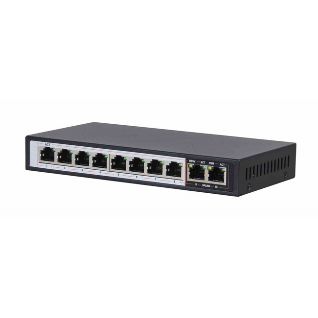 Switch class: Unmanaged Application: Medium and large companies Switch layer: L2 Network architecture: GigabitEthernet Number of 10/100/1000 Mbps ports: 10 Number of PoE ports (PoE & PoE+): 8 Number of PoE+ ports: None Console port: No Forwarding mode: Store-and-forward Support for Jumbo frames: No Stackability: No Supported protocols and standards:- IEEE802.3i