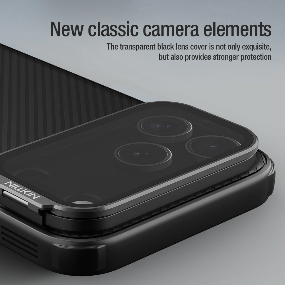 Η θήκη της σειράς CamShield Prop της Nillkin χαρακτηρίζεται από την ενισχυμένη προστασία που προσφέρει, το σκληρό υλικό κατασκευής της με την ανάγλυφη επιφάνεια, αλλά και την έξτρα προστασία των καμερών και της ιδιωτικότητας σας, χάρη στο ανοιγόμενο μεταλλικό καπάκι καμερών, το οποίο μπορεί να χρησιμοποιηθεί και ως stand.