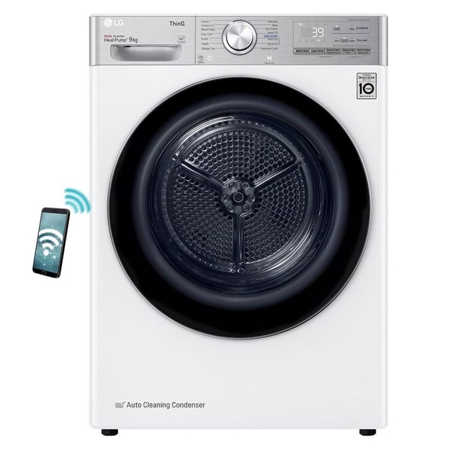 - Αυτοκαθαριζόμενος συμπυκνωτής Αυτόματος καθαρισμός που αποδίδει πάντα Τα χνούδια και η σκόνη στα κοινά στεγνωτήρια εμποδίζουν την κυκλοφορία του αέρα, αυξάνοντας την κατανάλωση ενέργειας. Αυτό όμως δεν ισχύει στο στεγνωτήριο της LG, γιατί τα αφαιρεί αυτόματα. Η δυνατή ροή του νερού στο στεγνωτήριο της LG, απομακρύνει αυτόματα το χνούδι και τη σκόνη. Έτσι αυτοκαθαρίζεται και ο καταναλωτής δεν χρειάζεται να κάνει τίποτα. Τεχνολογία Smart Pairing Τέλειος συγχρονισμός μεταξύ πλυντηρίου και στεγνωτηρίου Το στεγνωτήριο μπορεί να λάβει πληροφορίες για τον κύκλο πλύσης από το LG πλυντήριο (μέσω Wi-Fi) και αυτόματα να επιλέξει το κατάλληλο πρόγραμμα στεγνώματος, δίνοντας στα ρούχα την προστασία που τους αξίζει.