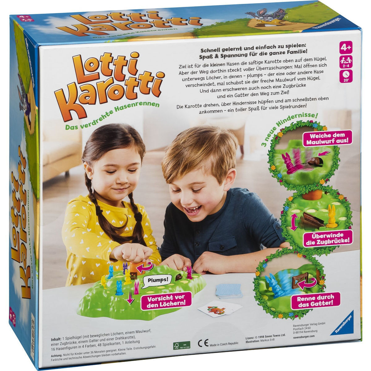 Ravensburger Lotti Karotti: The Twisted Rabbit Race is a children's action and race board game for 2-4 players, recommended for ages 4+ and playable up to 99 years. Players race bunny figures up a winding 3D carrot hill using movement cards instead of dice, advancing 1-3 spaces while avoiding holes...