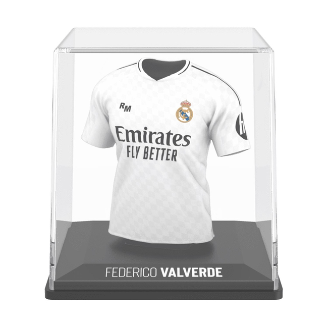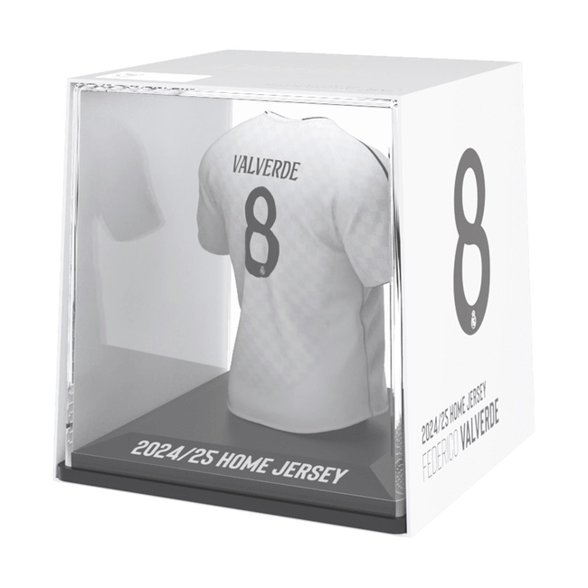 The FanCollex MyJersey - Real Madrid Home 2024/25 - Valverde is an exceptional addition to any collector's ensemble. This unique product captures the essence of Federico Valverde, a key player in Real Madrid, through a meticulously crafted figurine and an innovative jersey design that showcases the team's rich history.