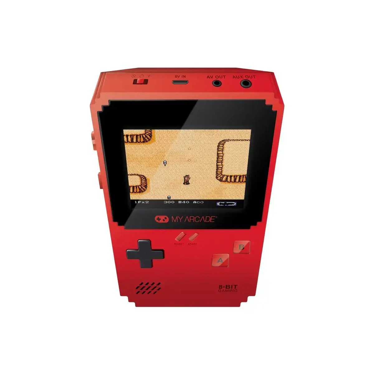 The dreamGear My Arcade Pixel Classic is a portable handheld gaming console featuring 300 built-in retro games, including 8 officially licensed Data East titles such as BurgerTime, Karate Champ, and Bad Dudes. It includes a full-color LCD screen of approximately 3 inches, directional pad controls, action buttons with backlighting, a front speaker, volume control, and a power switch. Connectivity includes a 3.5mm headphone jack and AV-out for TV/monitor use, plus micro USB or USB-C power input depending on packaging/region, with cable not included. The system is powered by 4 AAA batteries (battery tray included) or an external cable, and does not have a built-in rechargeable battery. Compact and pocket-sized, it is designed for on-the-go retro gaming with an 8-bit style aesthetic.