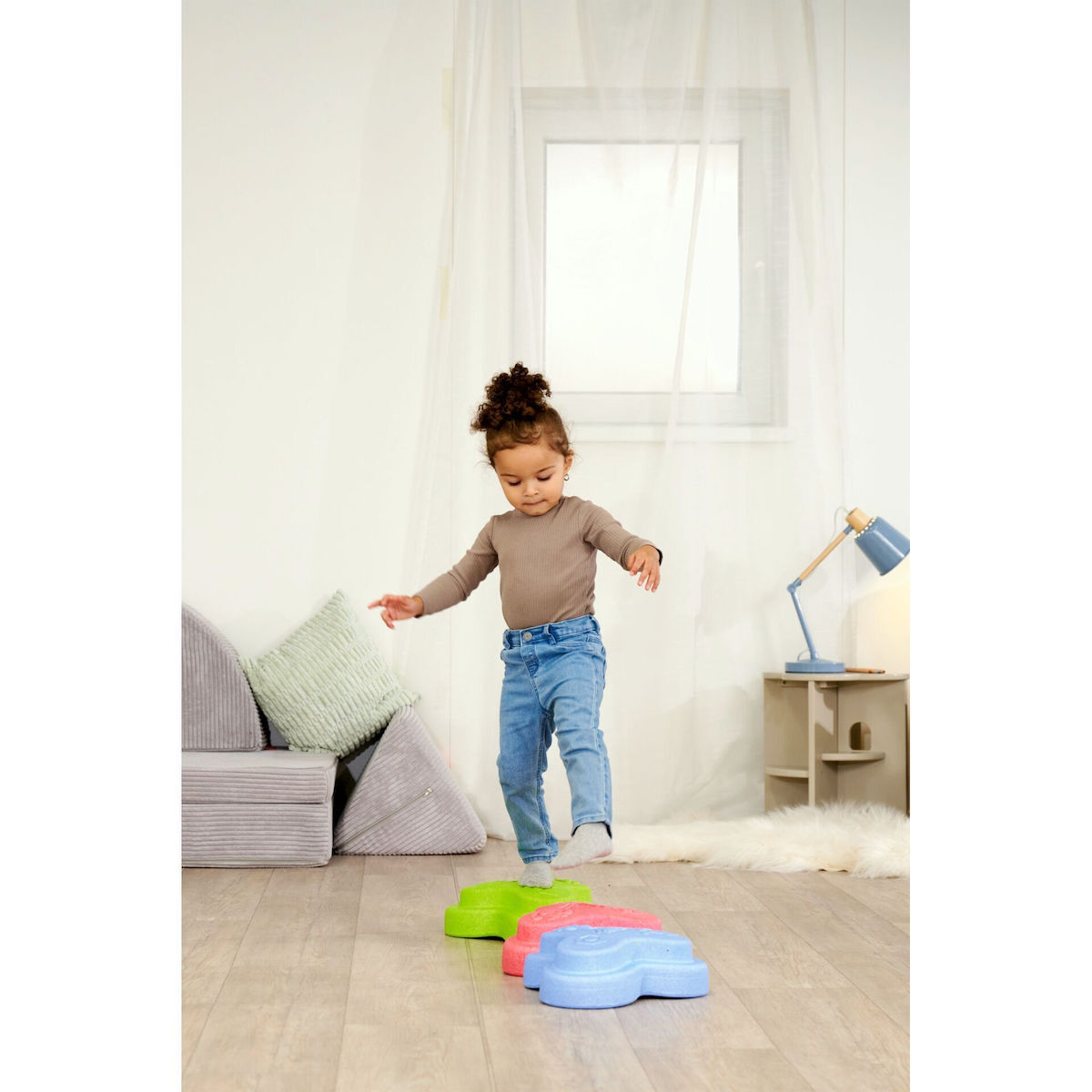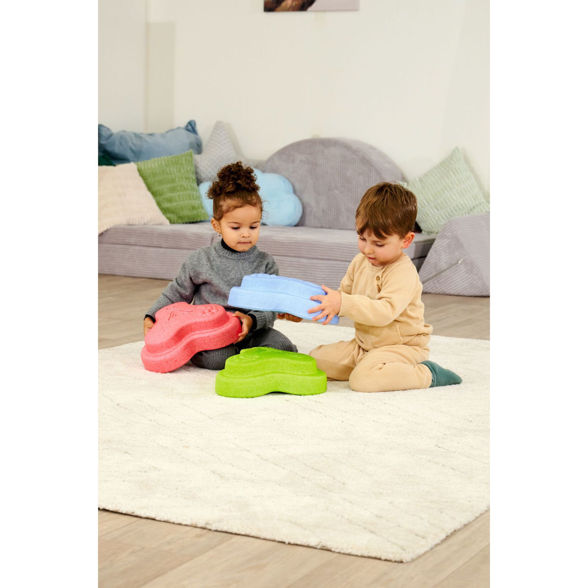 BIG Heppy Rocks Stackable by BIG is a set of five colorful stacking stones designed for balance play, movement activities, and creative open-ended play. Made from durable EPP (expanded polypropylene) foam, the pieces are lightweight, robust, and suitable for both indoor and outdoor use. The surfaces feature three different textures for tactile exploration, and the product is saliva- and sweat-resistant and easy to clean. It supports the development of motor skills, coordination, and balance, and can be used as a balance path, small hurdle, seating option, or imaginative play element. Suitable for children from 12 months old. Assembled dimensions: 29 x 25 x 9 cm. Maximum load capacity: up to 120 kg.