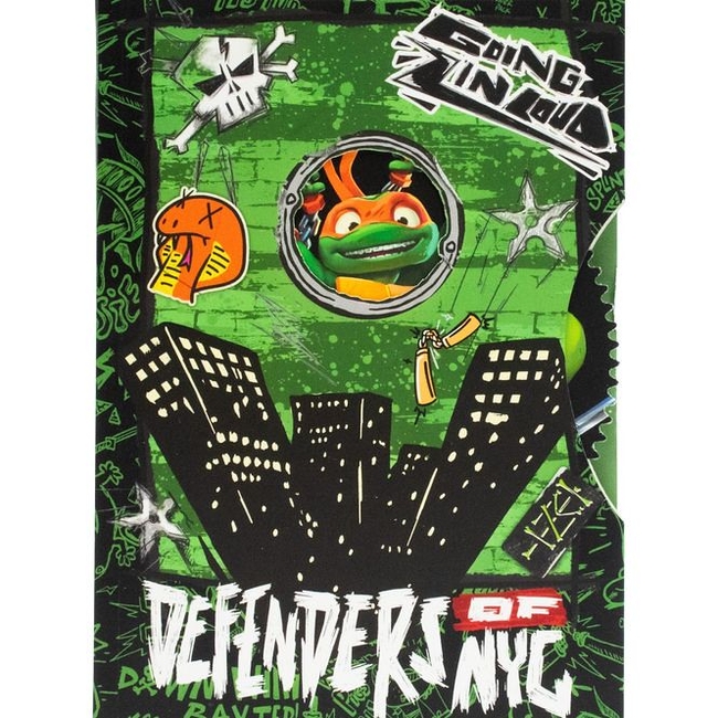 The eye-catching green cover incorporates graffiti and street art elements, captivating both children and adults alike. A round window at the center showcases a beloved TMNT character, adding a delightful charm to the notebook.