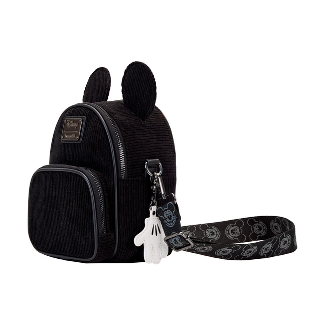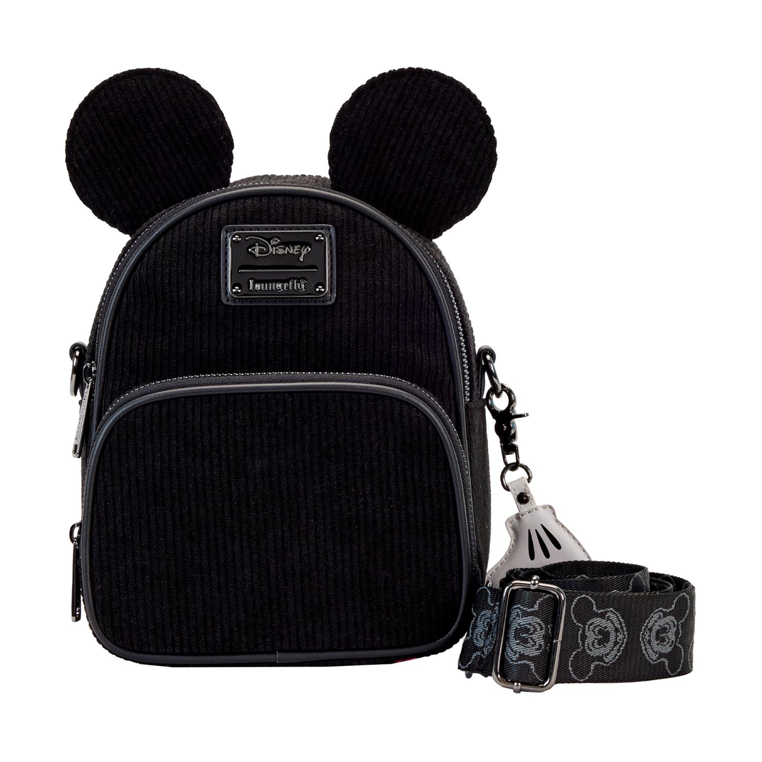 The Loungefly Disney 100th: Mickey Mouse Corduroy Convertible Crossbody Bag (WDTB3207) combines style with functionality. It features a unique design that showcases Mickey Mouse's iconic silhouette, complete with appliqué ears made from black corduroy fabric.