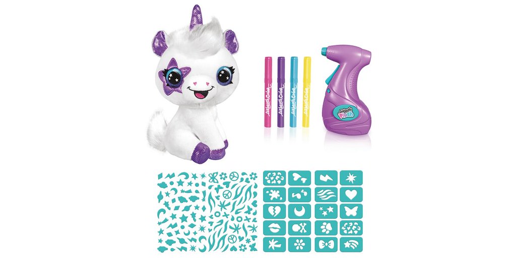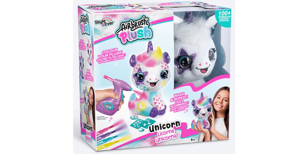 - Contents: 1 x plush unicorn, 1 x airbrush gun, 4 x airbrush colors, 100+ reusable stencils
