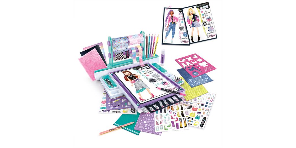 - Design Tools & Materials: Comes with 6 colored pencil crayons, 1 double-tip marker, 3 fashion stencils, 5 self-adhesive fabric sheets, and various printed fashion papers.