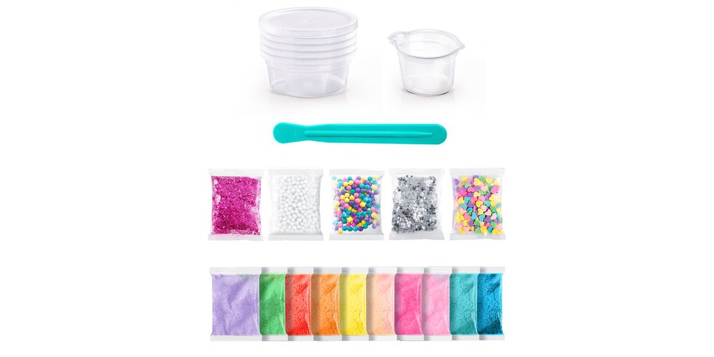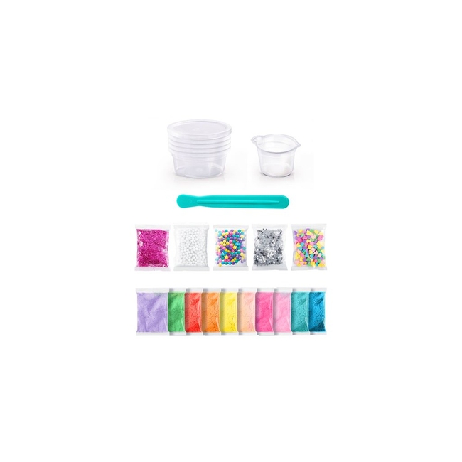 - Πούδρες slime, διακοσμητικά, λεκάνι, εργαλείο, δοχεία αποθήκευσης, οδηγίες