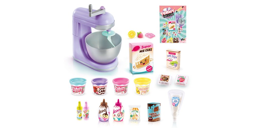 - 1 spinning mixer & bowl, 1 white slime base, 1 brown powder, 2 bottles of dyes, 2 charms, 4 decorations, 1 sheet of stickers, 1 recipe guide