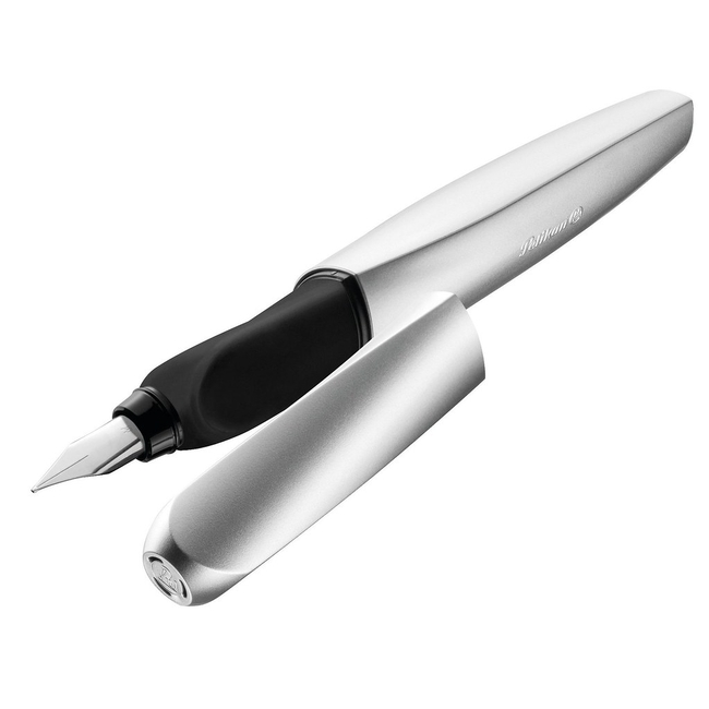 The Pelikan Twist P457 M Silber +1GTP folding box is a stylish and ergonomic fountain pen praised for its unique spiral design and high-quality German craftsmanship.