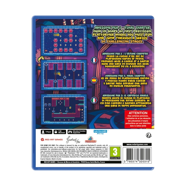 Awesome Pea 3 (PS5) is a thrilling platform video game that offers an exciting experience with its pixel art graphics and captivating chiptune soundtrack. Developed and published by Red Art Games, this game delivers fast-paced action across over 69 challenging levels.