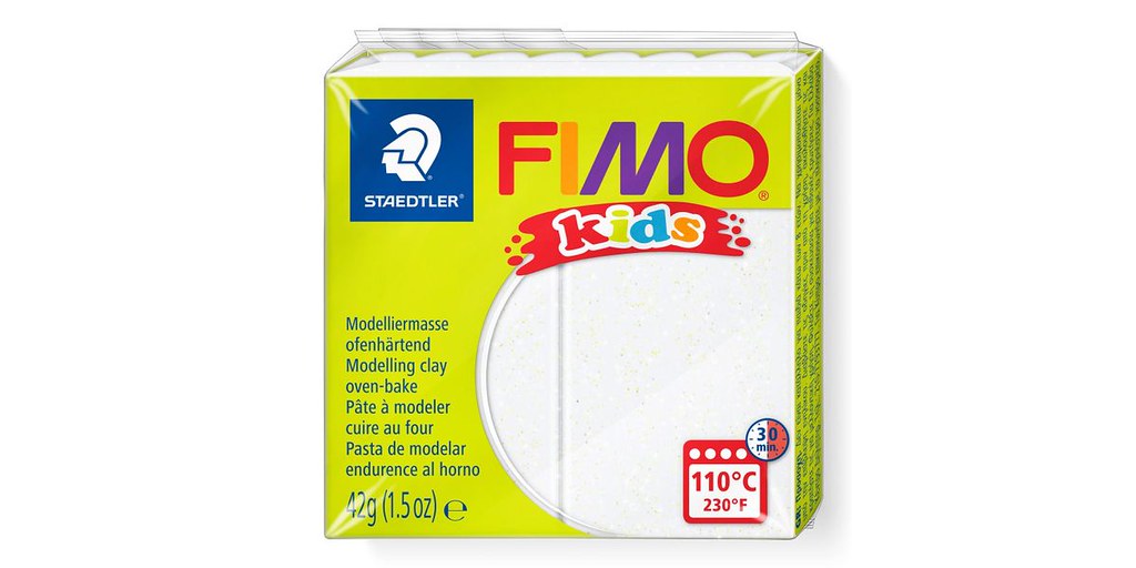 Fimo Kids White Glitter is a specially formulated polymer modelling clay designed for children. It features a soft, easy-to-mould texture and a vibrant white base enriched with fine glitter particles, making it ideal for creative crafting projects.