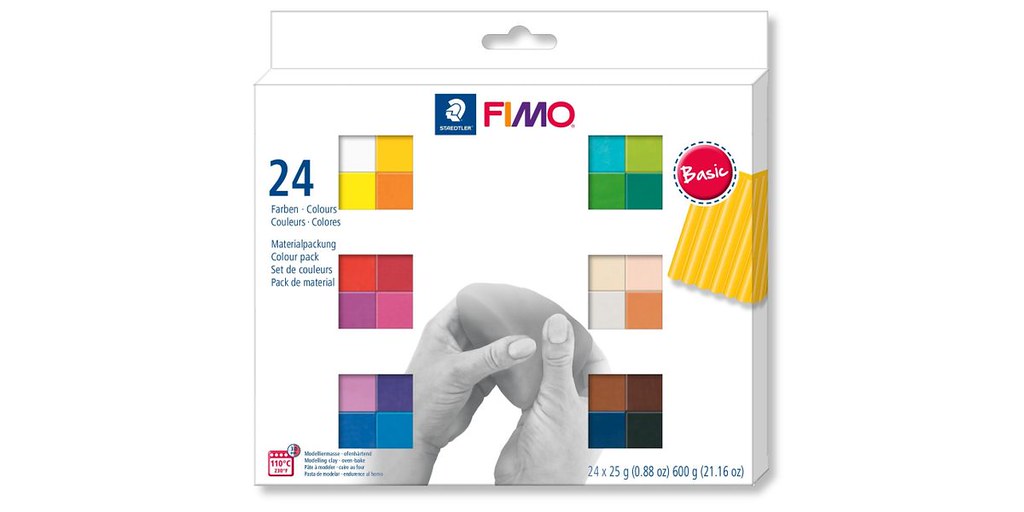 The Fimo Clay Set Mod.masse Fimo soft MP Basic Colours 24 pieces is a premium choice for artists and hobbyists alike. This set includes 24 blocks of soft, oven-hardening polymer clay, each weighing 25 grams, ensuring ample material for creative exploration.