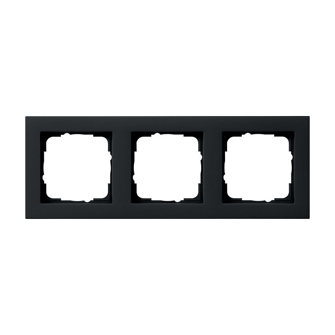 The GIRA 021309 is a versatile 3-gang outlet cover frame tailored for the Gira E2 electrical switch series, featuring a sleek black matte finish. This product excels in both functionality and aesthetics, making it an ideal choice for modern electrical installations.