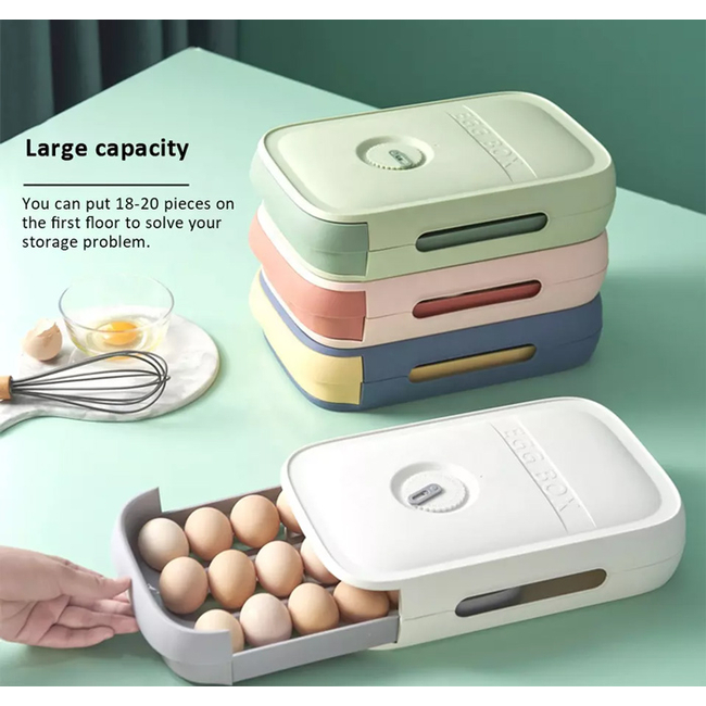Πλαστική θήκη ιδανική για την αποθήκευση 18 έως 20 αυγών. Διαθέτει συρόμενη πόρτα γεγονός που διευκολύνει την πρόσβαση στα αποθηκευμένα αυγά. Μπορεί να τοποθετηθεί σε πάγκο κουζίνας αλλά και σε ψυγείο.