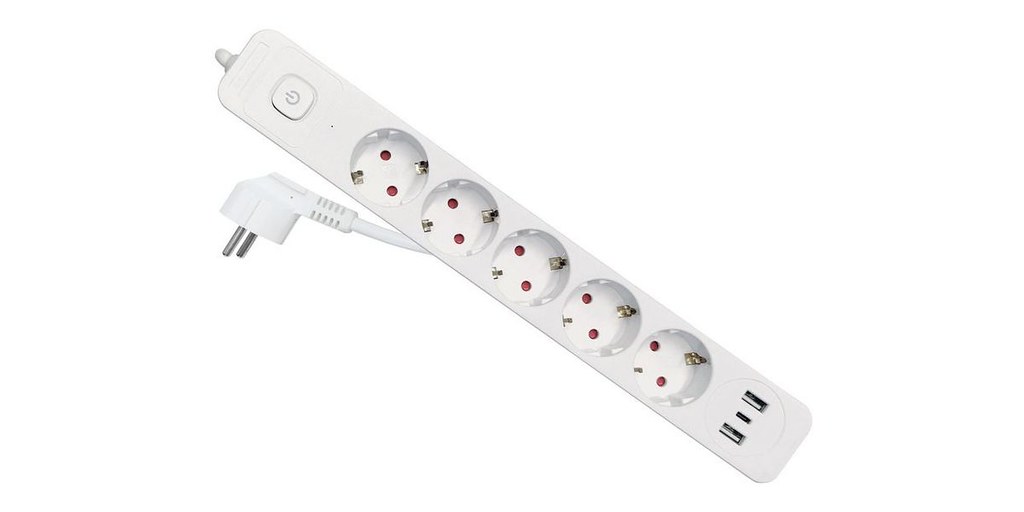 - 5 x Schuko (CEE 7/3/7), 2 x USB-A (5V, 2.4A total), 1 x USB-C (5V, 3A)