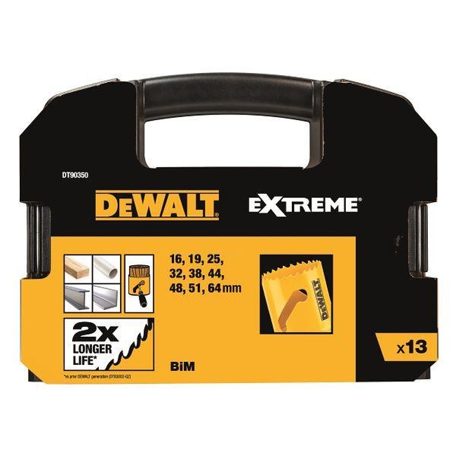 The DeWalt DT90350-QZ 13-piece hole saw set is an exceptional tool designed for heavy-duty drilling applications. This set is ideal for use across various materials including wood, metal, plastic, and other hard surfaces. With a total of 13 pieces, it offers a comprehensive range of hole saw diameters from 16 mm to 64 mm.
