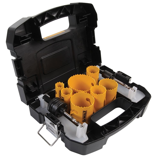 The Dewalt DT90352-QZ Set 11-part is an Extreme Bi-Metal Hole Saw set tailored for professionals, particularly electricians. This set includes a total of 11 high-quality components, consisting of hole saws, mandrels, pilot bits, and a convenient carry case.