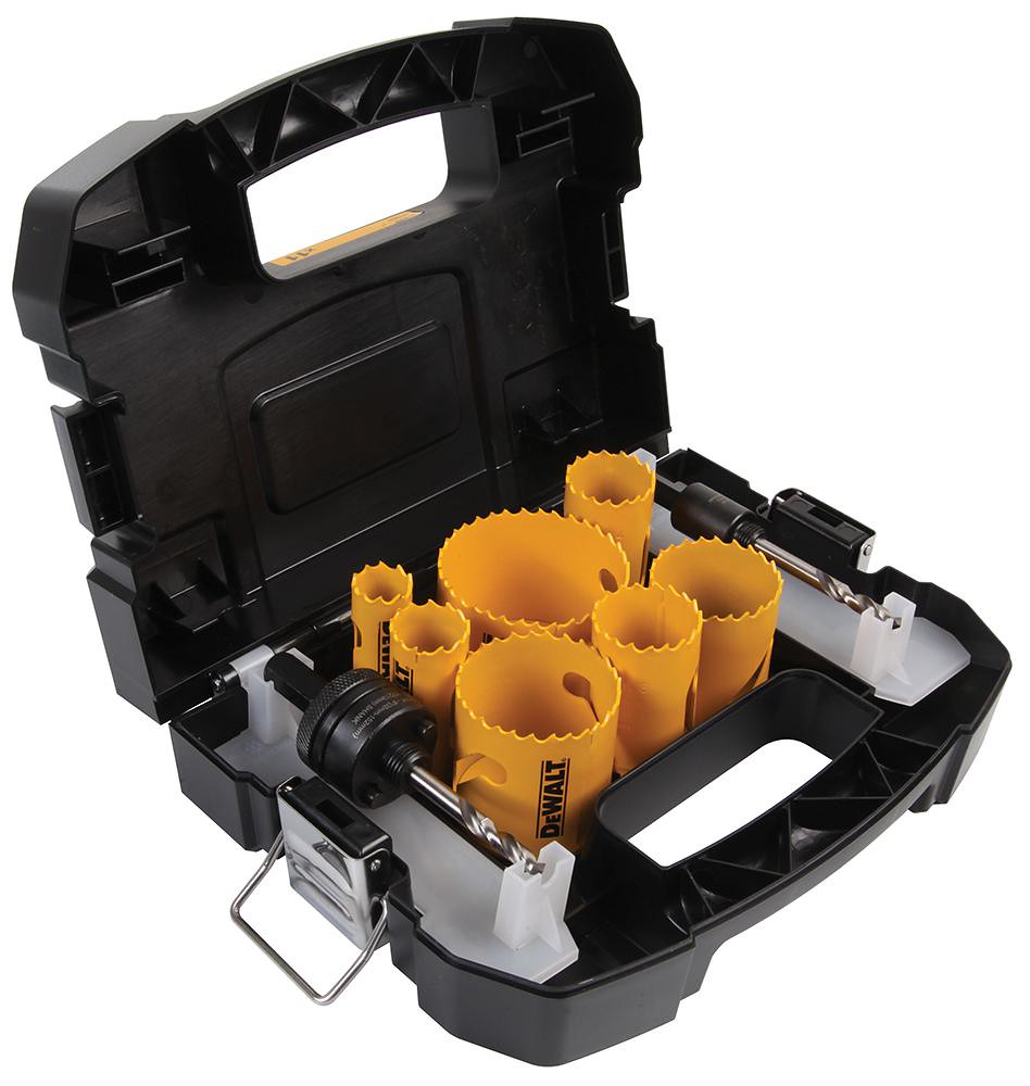 - 7 hole saw sizes (2064 mm), 2 mandrels, 2 pilot bits, carry case