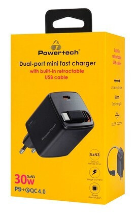 POWERTECH Wall Charger PT 1571 USB C 30W GaN Black with Retractable Cable