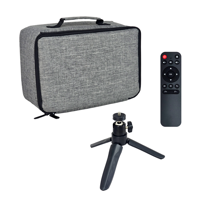 Στη συσκευασία συμπεριλαμβάνονται μίνι τρίποδας, τσάντα μεταφοράς και τηλεχειριστήριο για τις βασικές λειτουργίες του βιντεοπροβολέα.