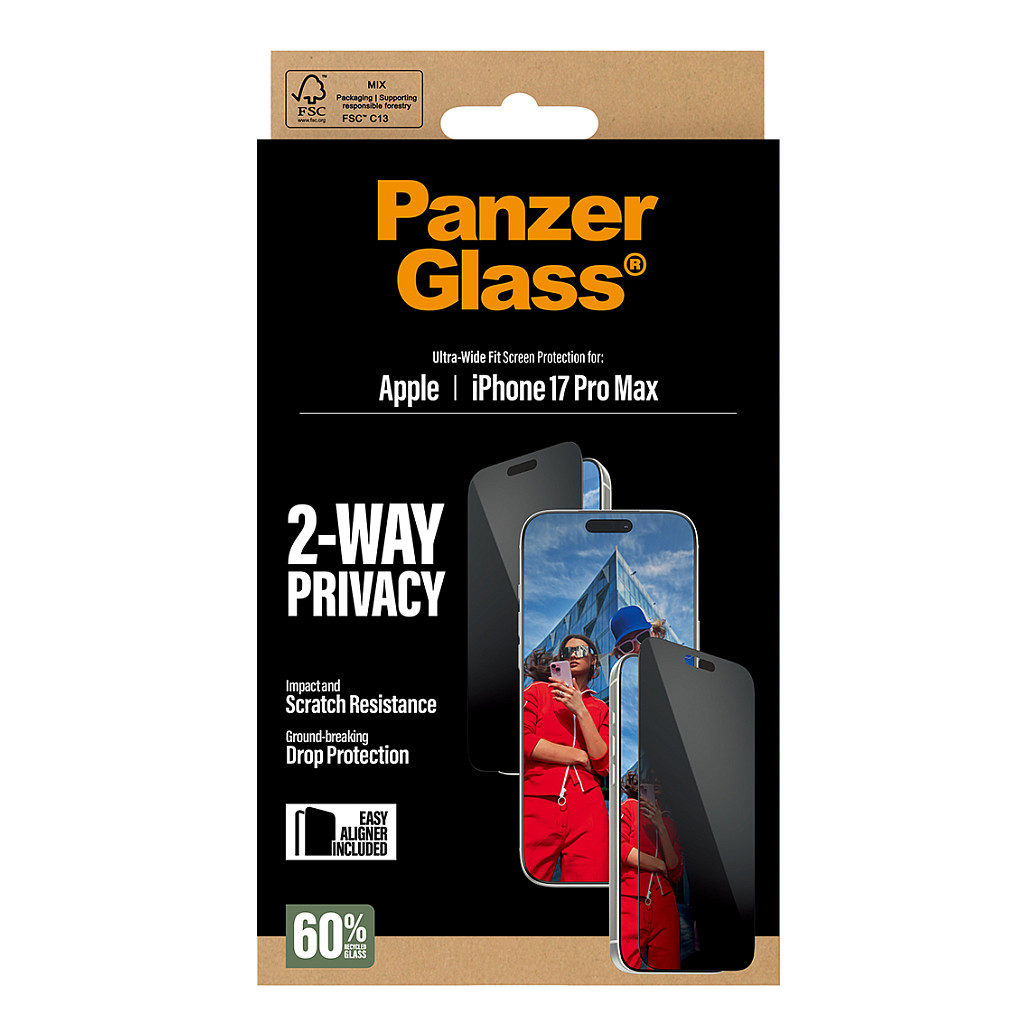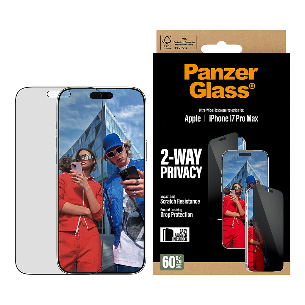The PanzerGlass 2-Way Privacy Screen Protector for iPhone 17 Pro Max is an exceptional tempered glass accessory that provides top-notch protection for your device's screen. What sets it apart is its 2-way privacy filtering feature, which makes content on your screen virtually invisible from side angles, making it the perfect choice for public spaces such as trains or offices.