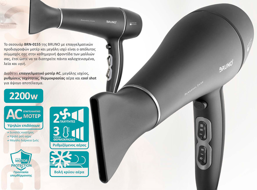 BRUNO σεσουάρ μαλλιών AC BRN-0155, 2200W, με φυσούνα, μαύρο