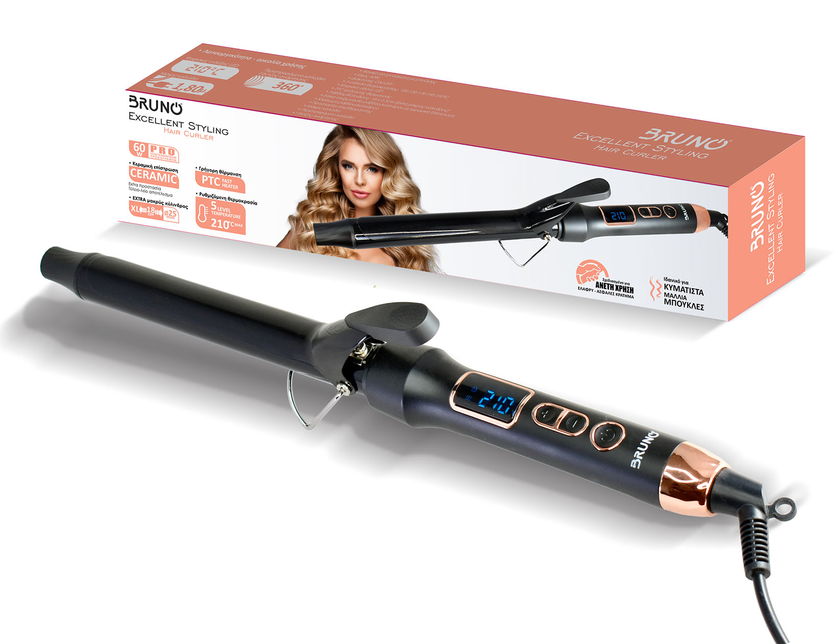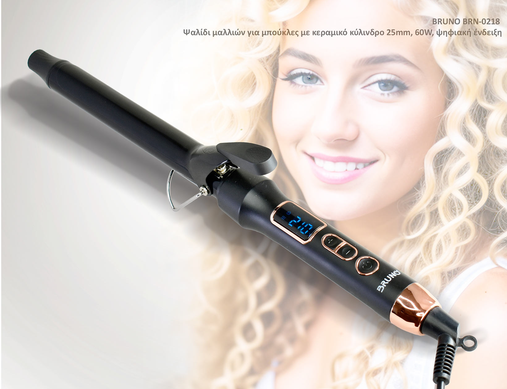 BRUNO BRN-0218 Ψαλίδι μαλλιών για μπούκλες με κεραμικό κύλινδρο 25mm, 60W, ψηφιακή ένδειξη, black-copper