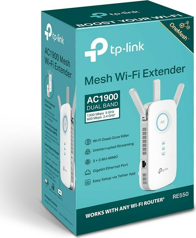 The TP-Link RE550 is an exceptional AC1900 Dual-Band Mesh Wi-Fi Range Extender that enhances your wireless network. It provides remarkable dual-band Wi-Fi capabilities, offering speeds of up to 600 Mbps on the 2.4 GHz band and 1300 Mbps on the 5 GHz band, resulting in a combined speed of 1900 Mbps.