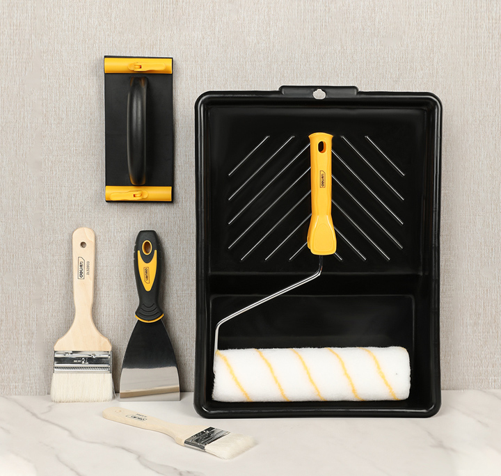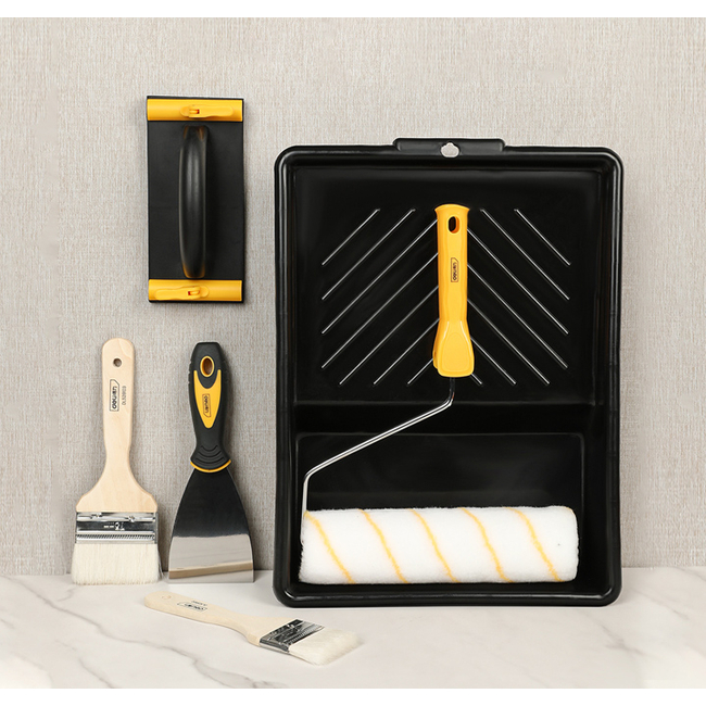 Σετ βαφής 6 σε 1 της Deli το οποίο αποτελείται από ρολό βαφής με λαβή, 2x πινέλα βαφής, σπάτουλα, γυαλοχαρτιέρα χειρός και σκάφη.