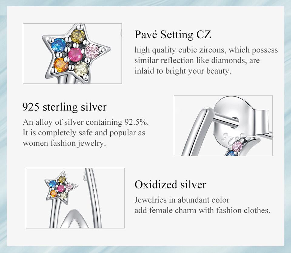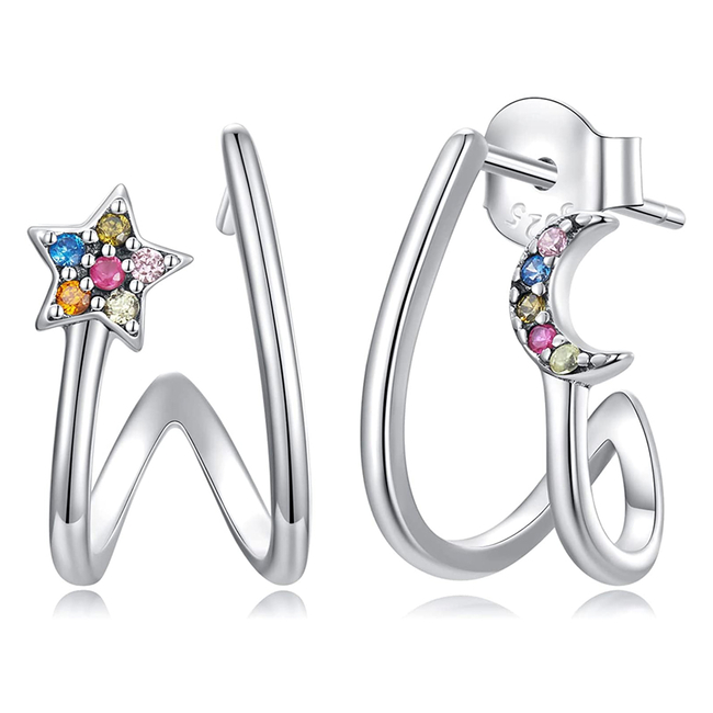 Εντυπωσιακά σκουλαρίκια με διπλό κρίκο Bamoer κατασκευασμένα από ασήμι 925, διακοσμημένα με σχέδιο αστέρι και ημισέληνος, με χρωματιστή κυβική ζιρκόνια.